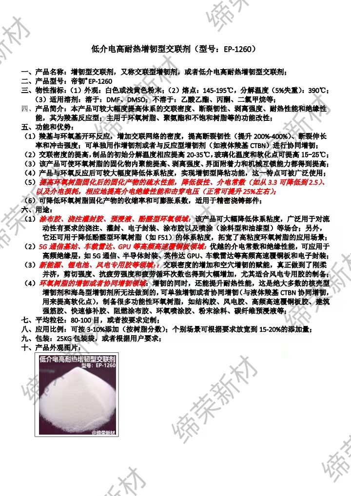 低介电高耐热增韧型交联剂,增韧型交联剂、交联型增韧剂,高频高速覆铜板,环氧增韧剂,环氧交联剂,流变改性剂,流动改性剂,粘度调节剂,环氧稀释剂,电子封装胶,半导体封装胶,5G通信基站,车载雷达,GPU、英伟达,交联剂,交联度调节剂,交联度促进剂;,风电专用胶,抗疲劳结构胶,耐疲劳剂;